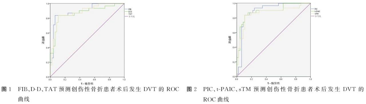 本次研究顯示,DVT組FIB、D-D、TAT、PIC、t-PAIC、sTM 顯著高于非DVT組,提示FIB、D-D、TAT、PIC、t-PAIC、STM可能與創(chuàng)傷性骨折患者術(shù)后DVT風(fēng)險(xiǎn)有關(guān)。